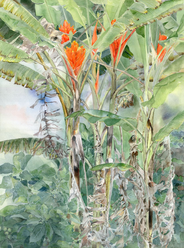 水彩画は沖縄で描いた花の新作品です。