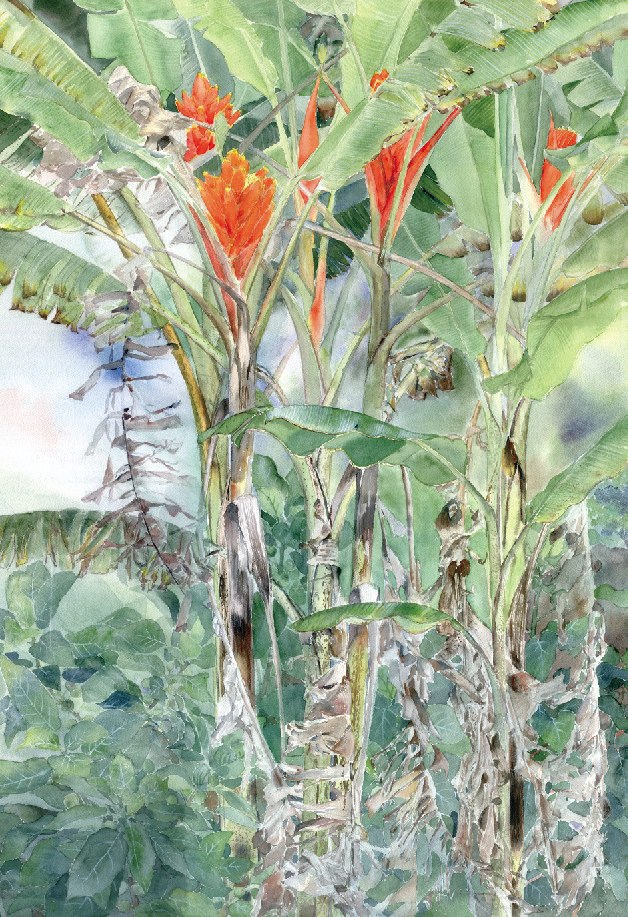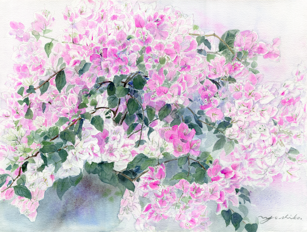水彩画は沖縄で描いた花の新作品です。